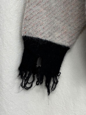 襟、袖、裾のリブに大胆なダメージ加工を施し、上品な見え感のなかにアクセントを加えました。