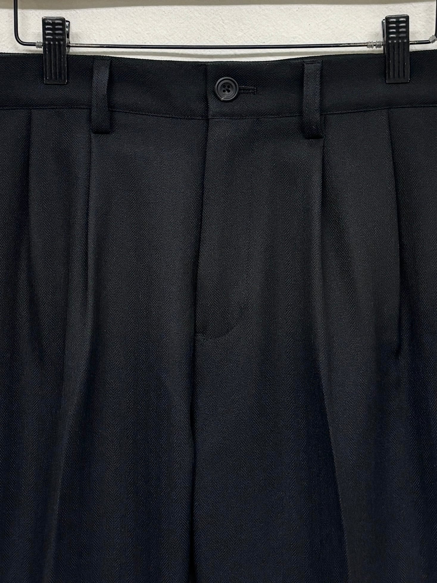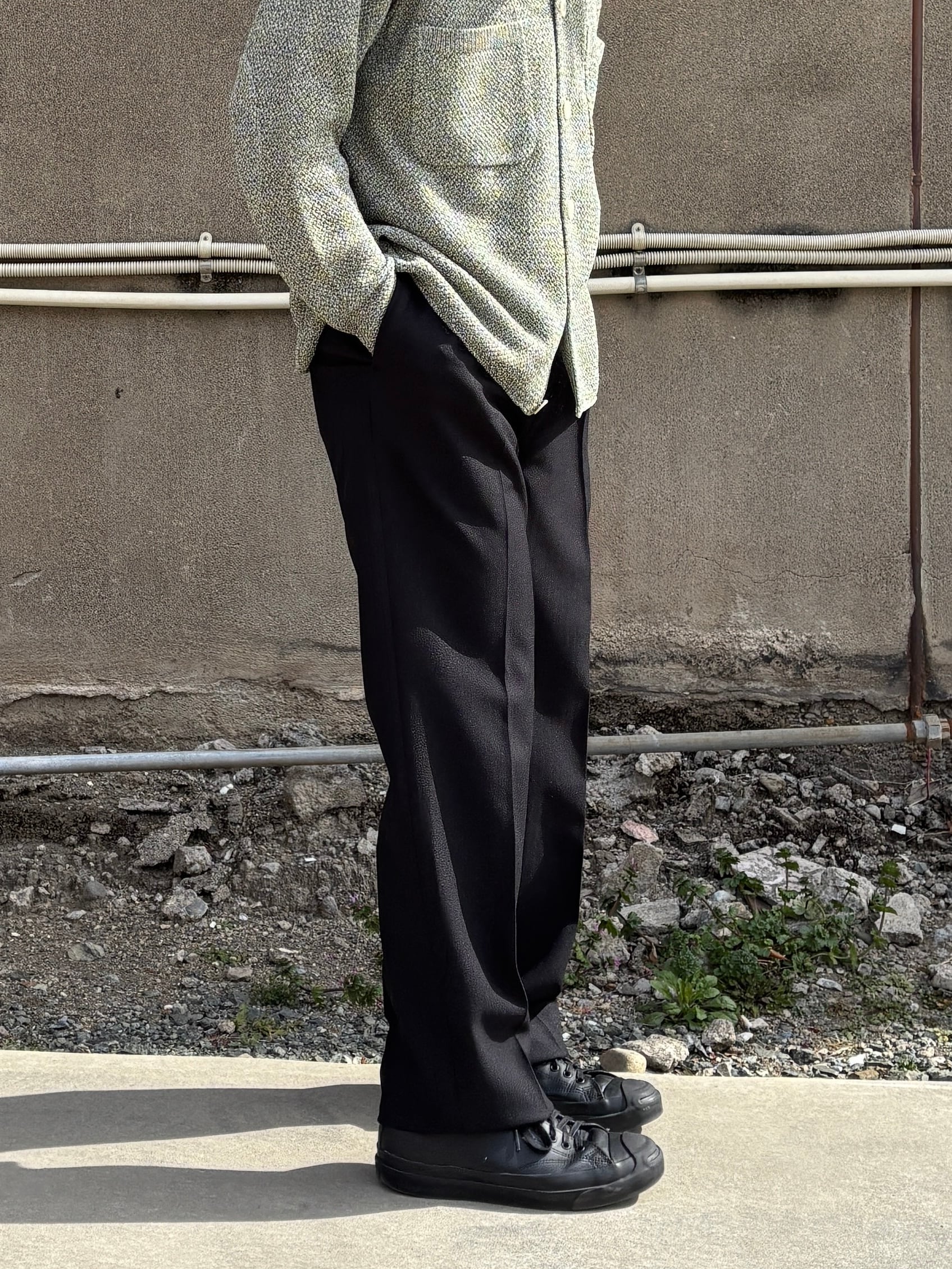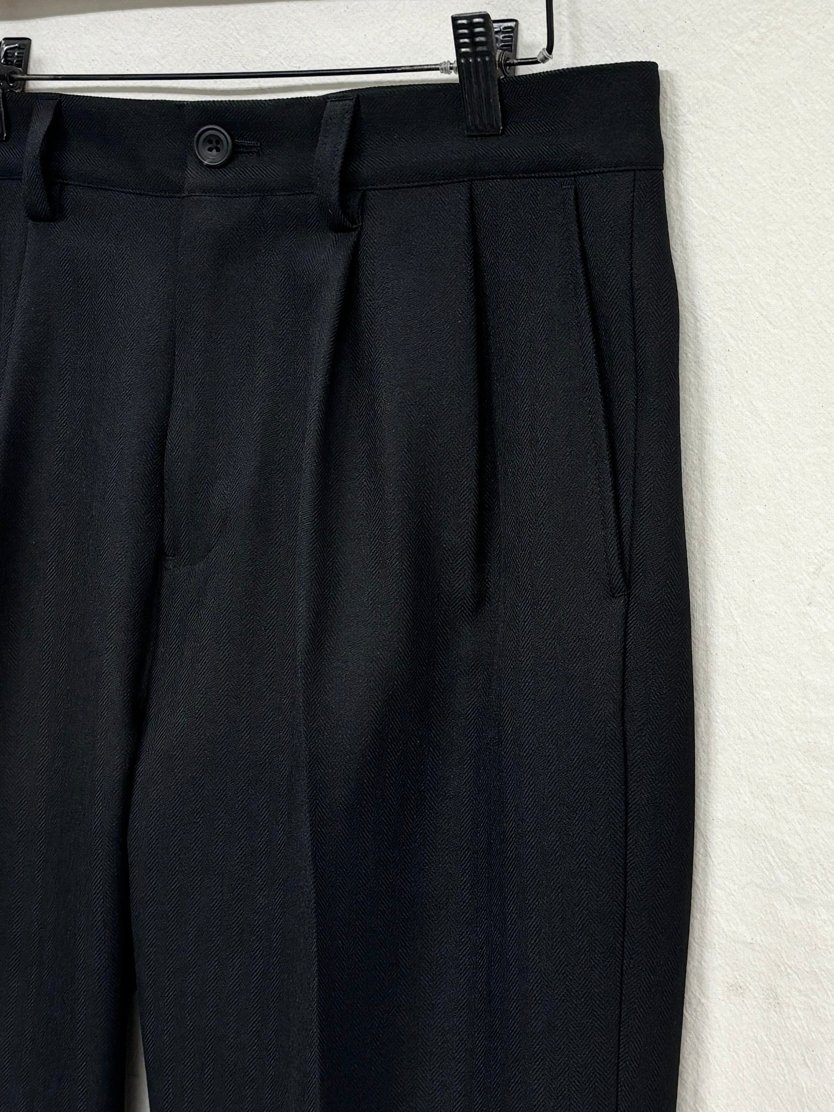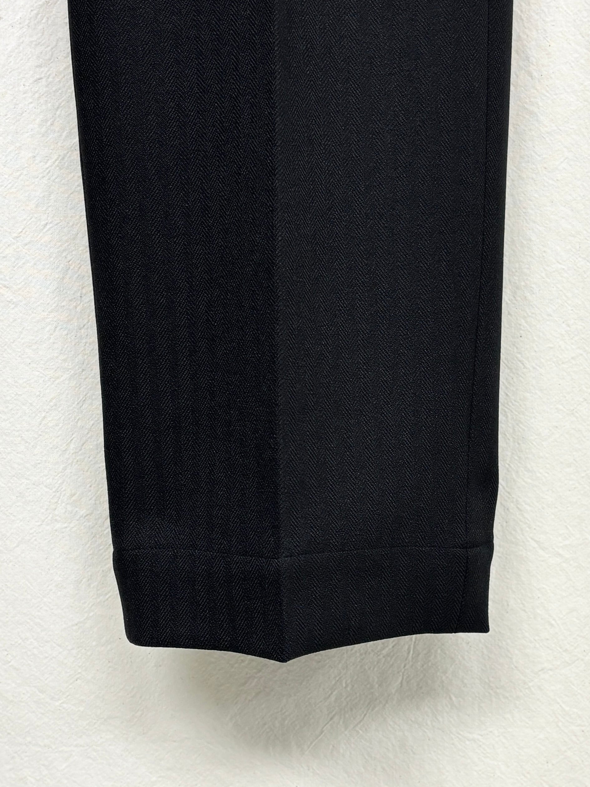 今期のテーマのワークスタイルにリンクしたドライ感のあるポリエステル糸とカチオン糸を使用することで染分けの表情感を出したヘリンボーン素材で仕立てタックパンツ。