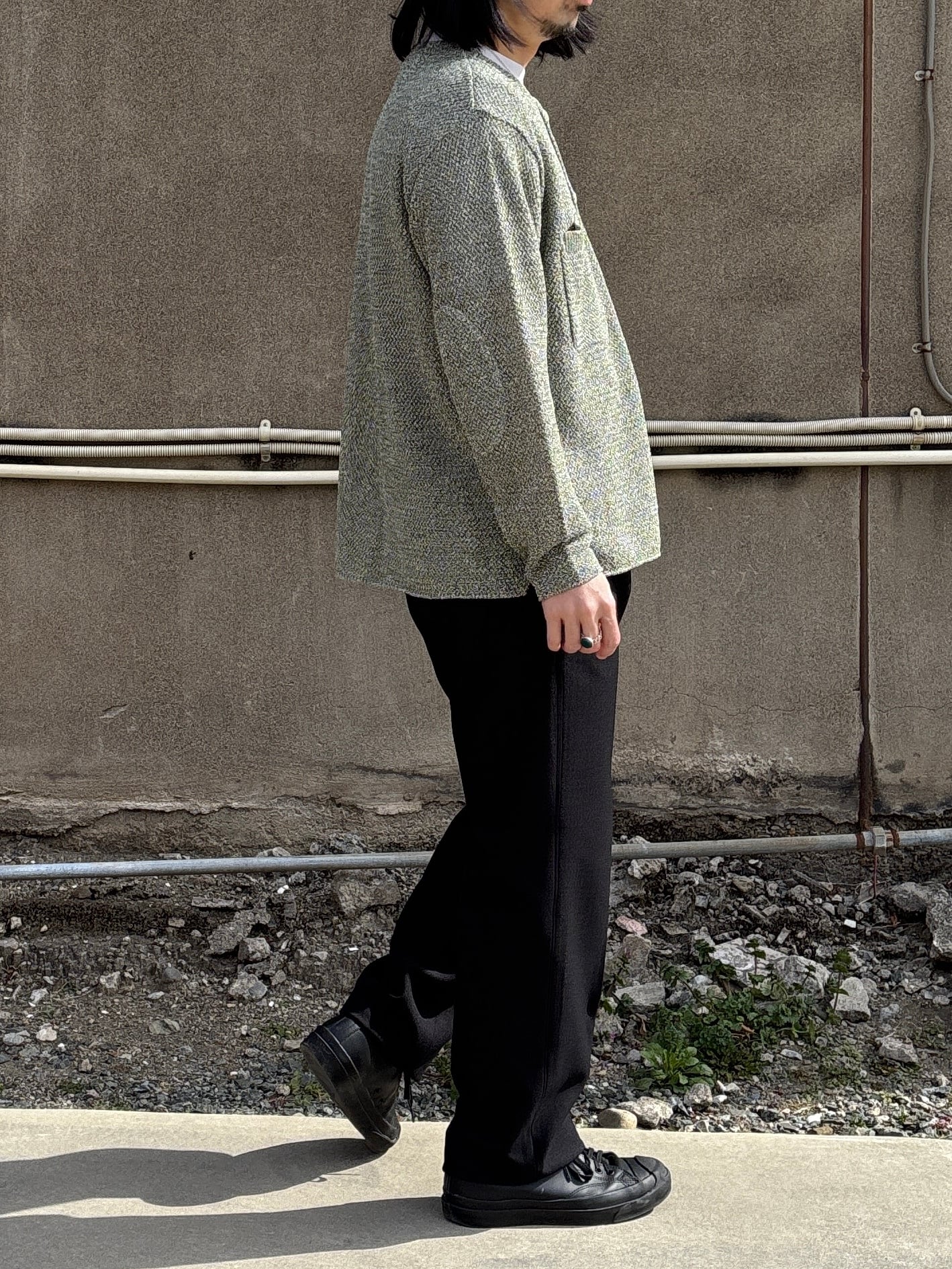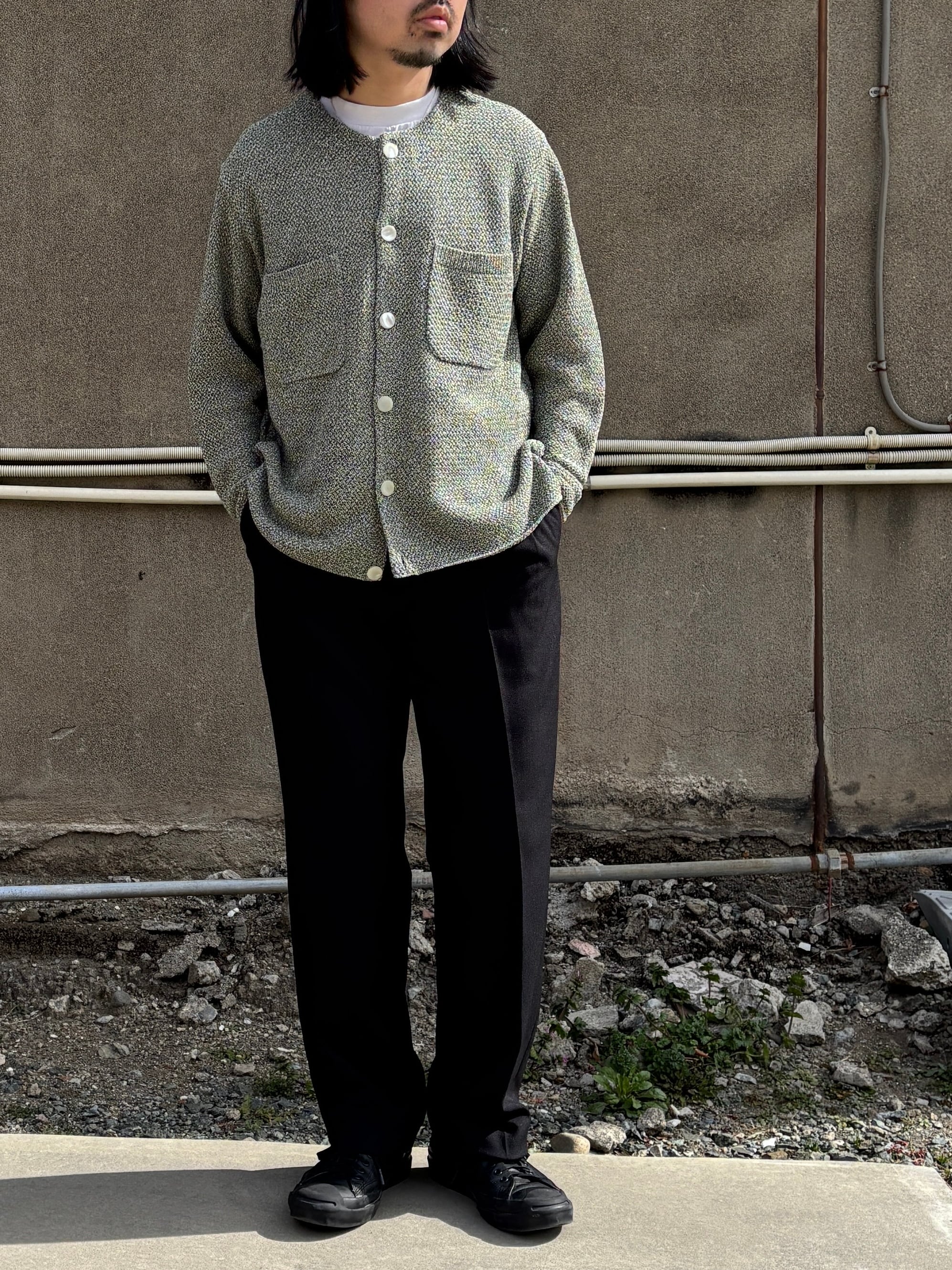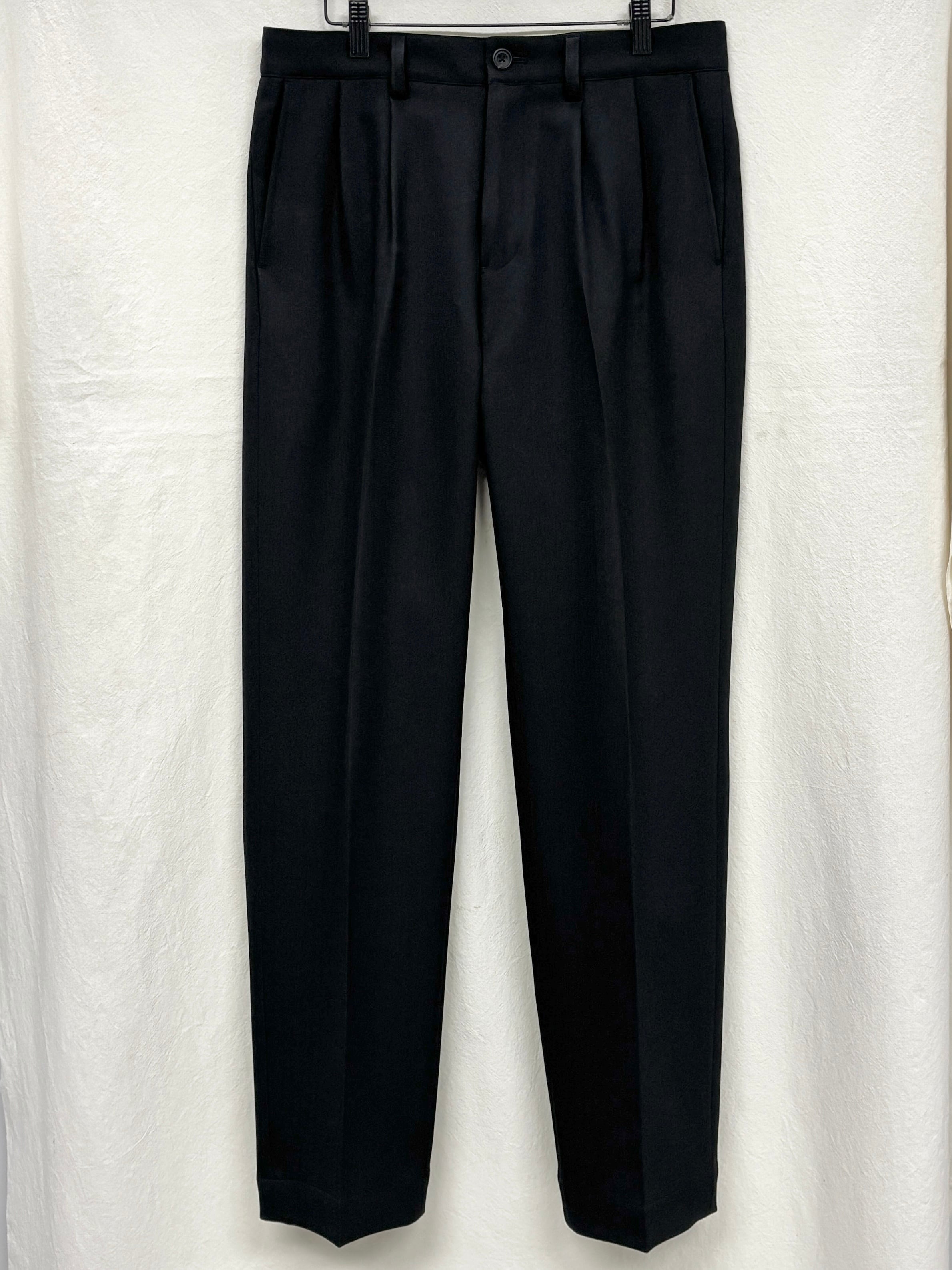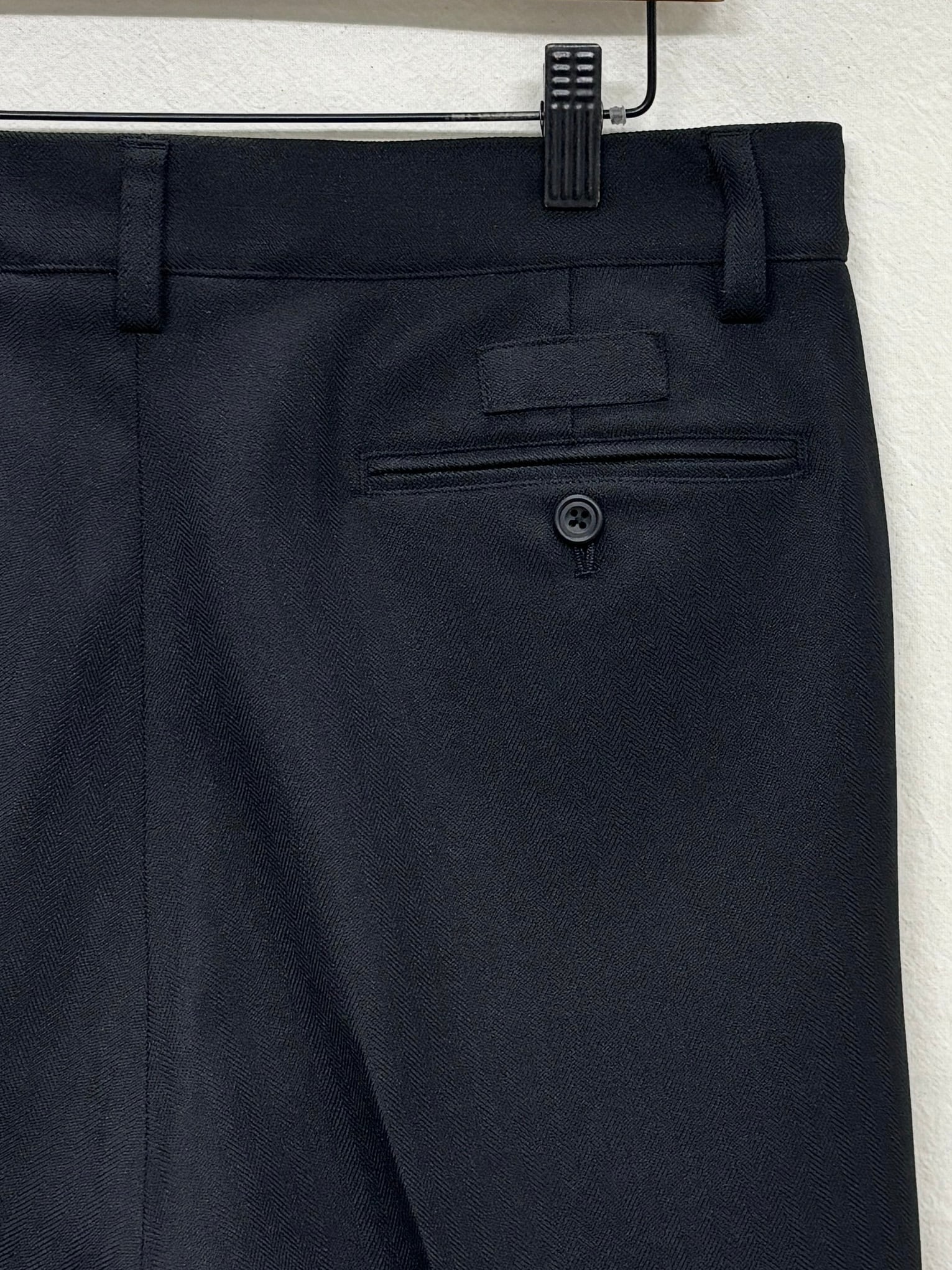 今期のテーマのワークスタイルにリンクしたドライ感のあるポリエステル糸とカチオン糸を使用することで染分けの表情感を出したヘリンボーン素材で仕立てタックパンツ。