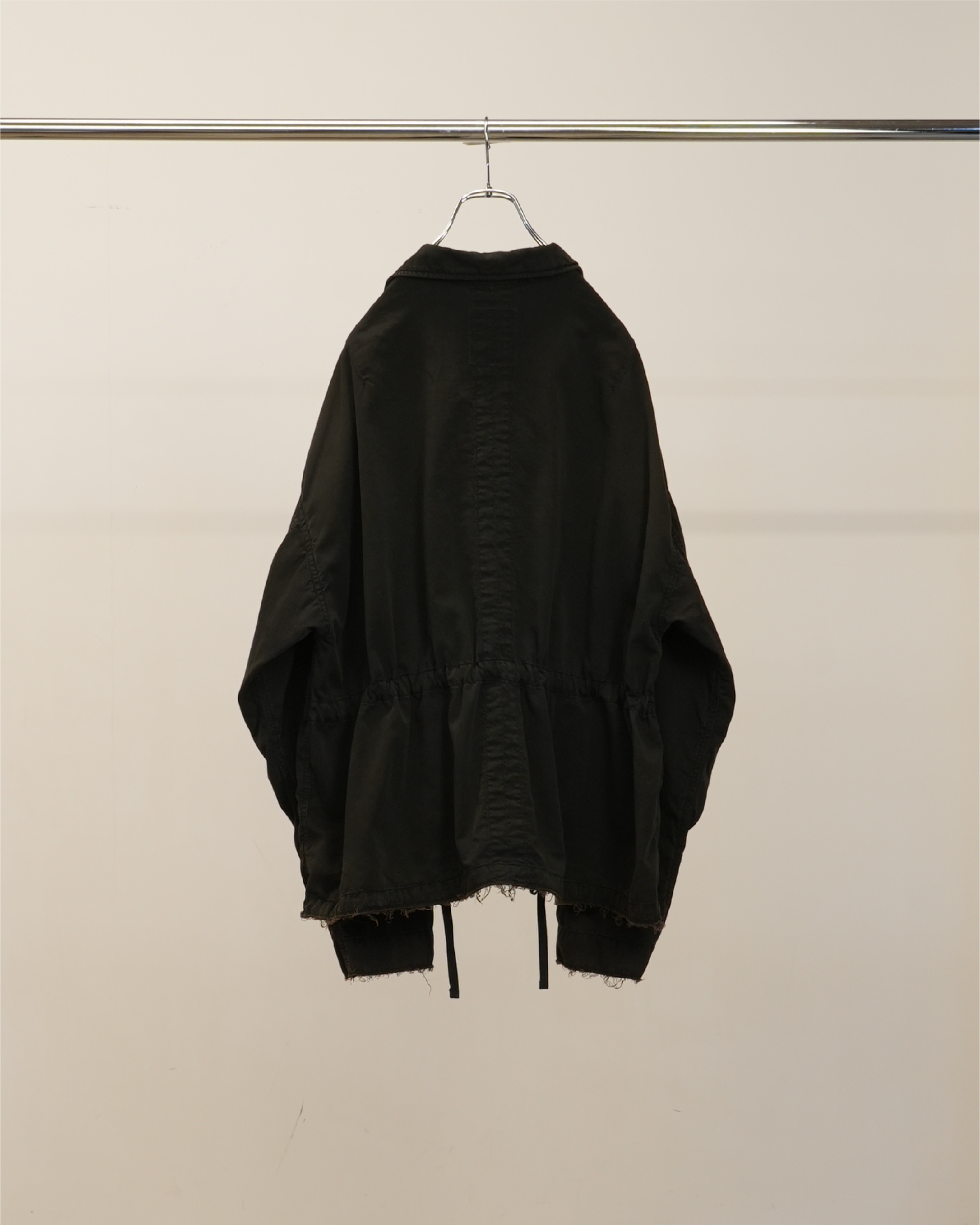 縫製に現れるパッカリングと蛇行、スナップのアタリ、断ち切りから垂れる糸など、粗さを含みながらも無骨になりすない羽織りやすさを目指し、全体のバランスを緻密に設計しております。