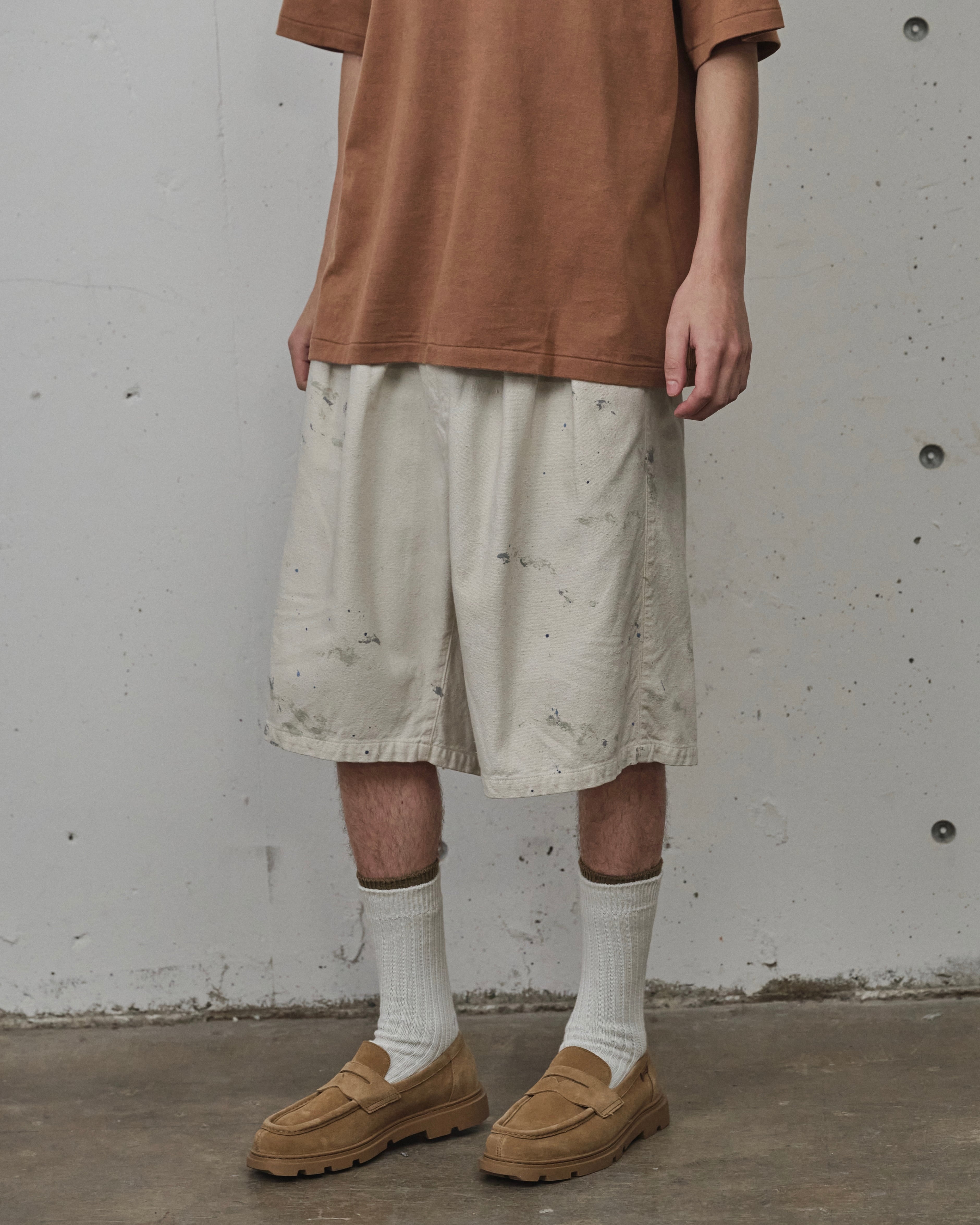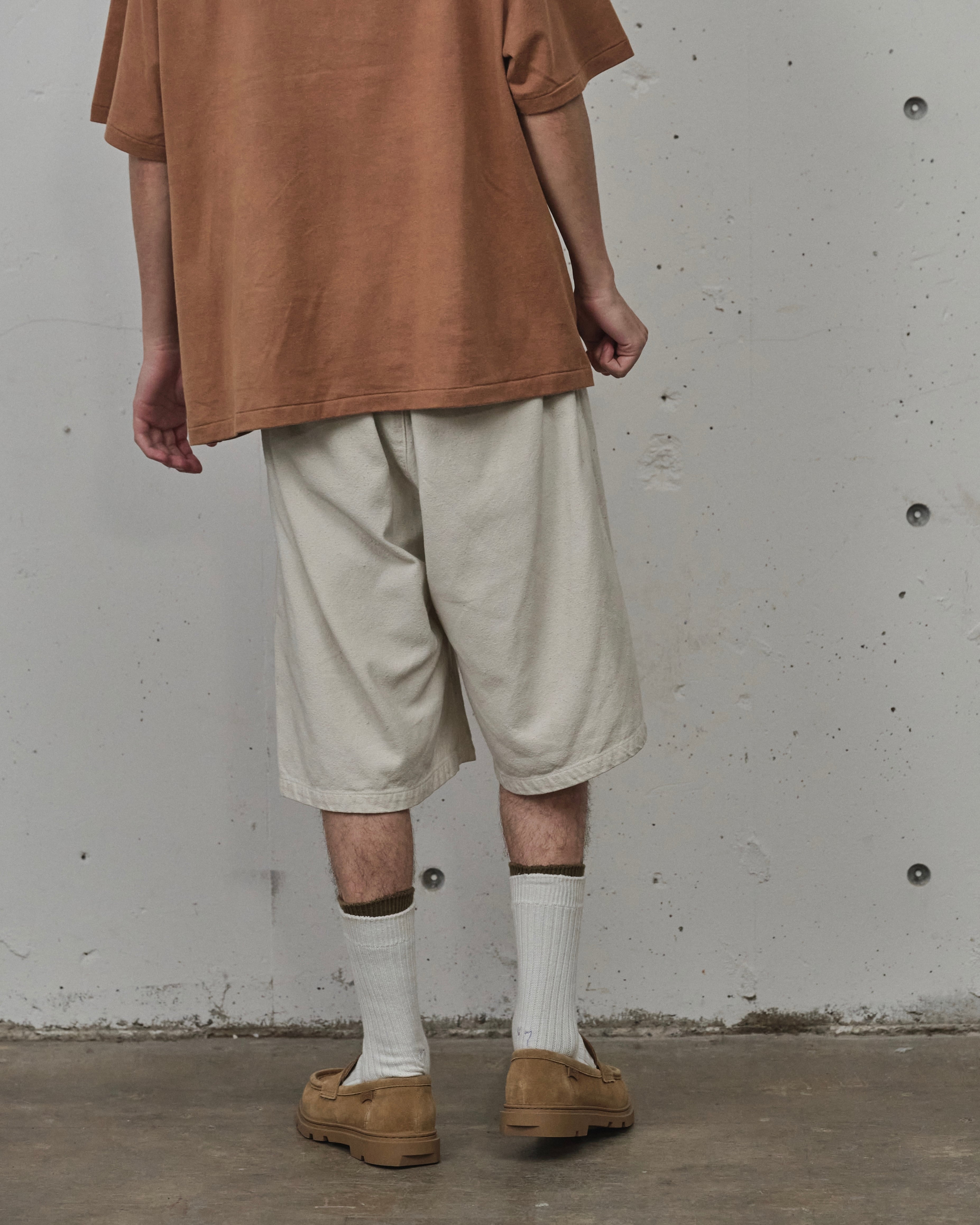 オリジナルで織り上げたダッククロスのワイドショーツ。