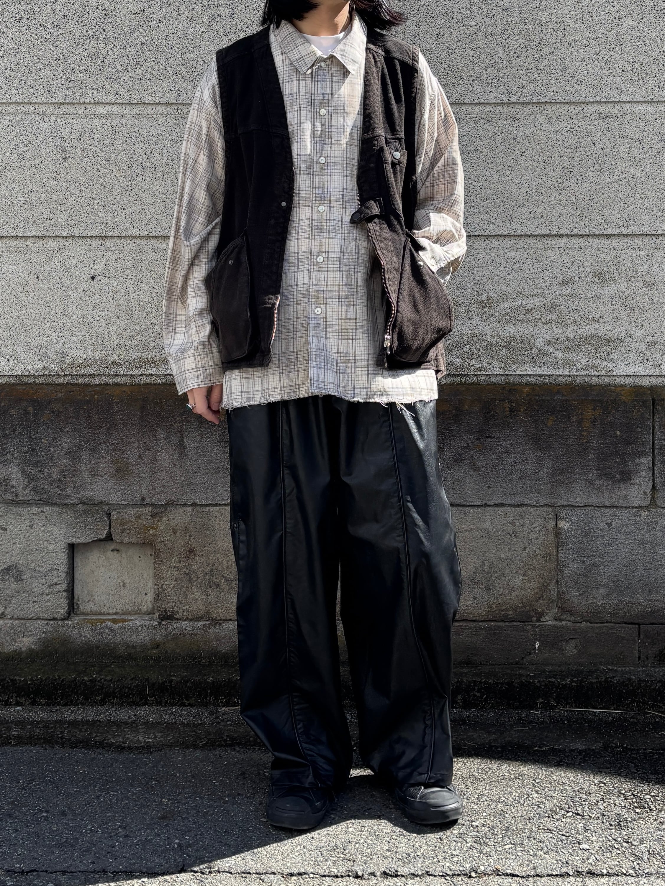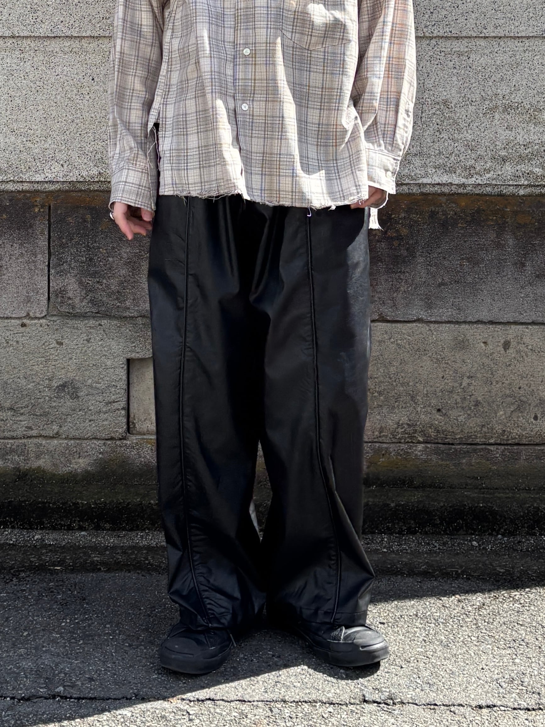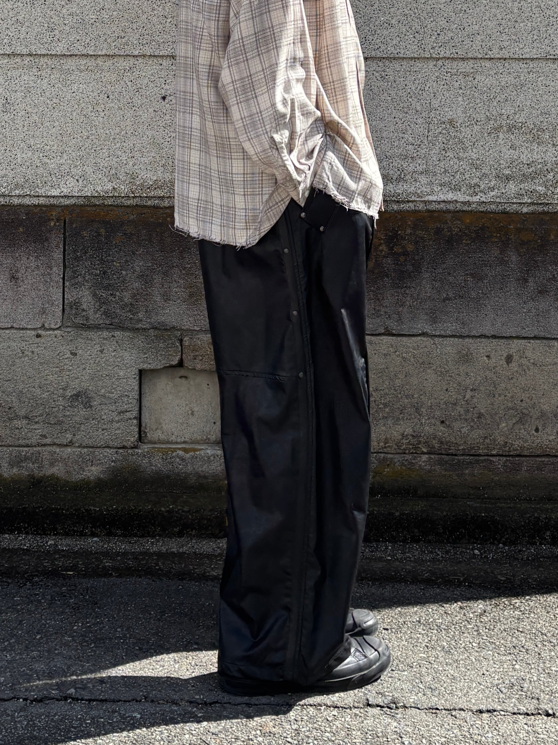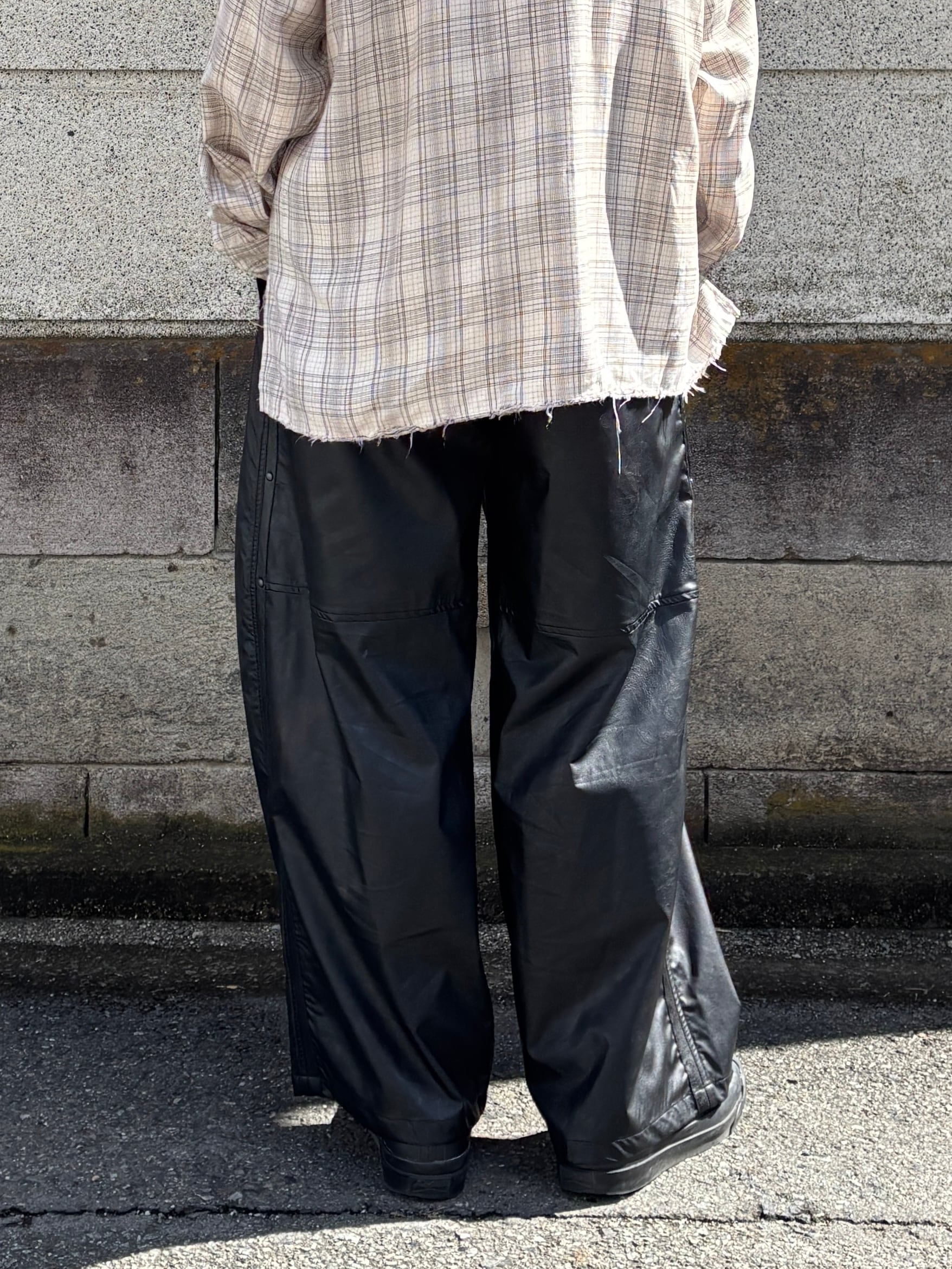 スタッズリベットとレザーテープがデザインされた ワイドストレートシルエットのパンツです。